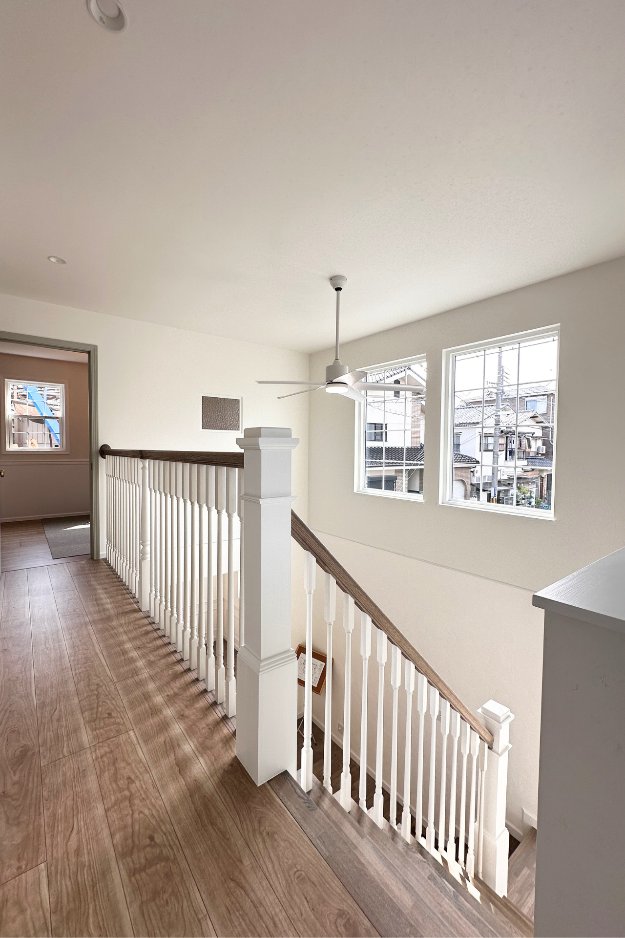西向きの為、午後から差し込む光で漆喰や、バラスター手すりの影がうまれ素敵な空間に。