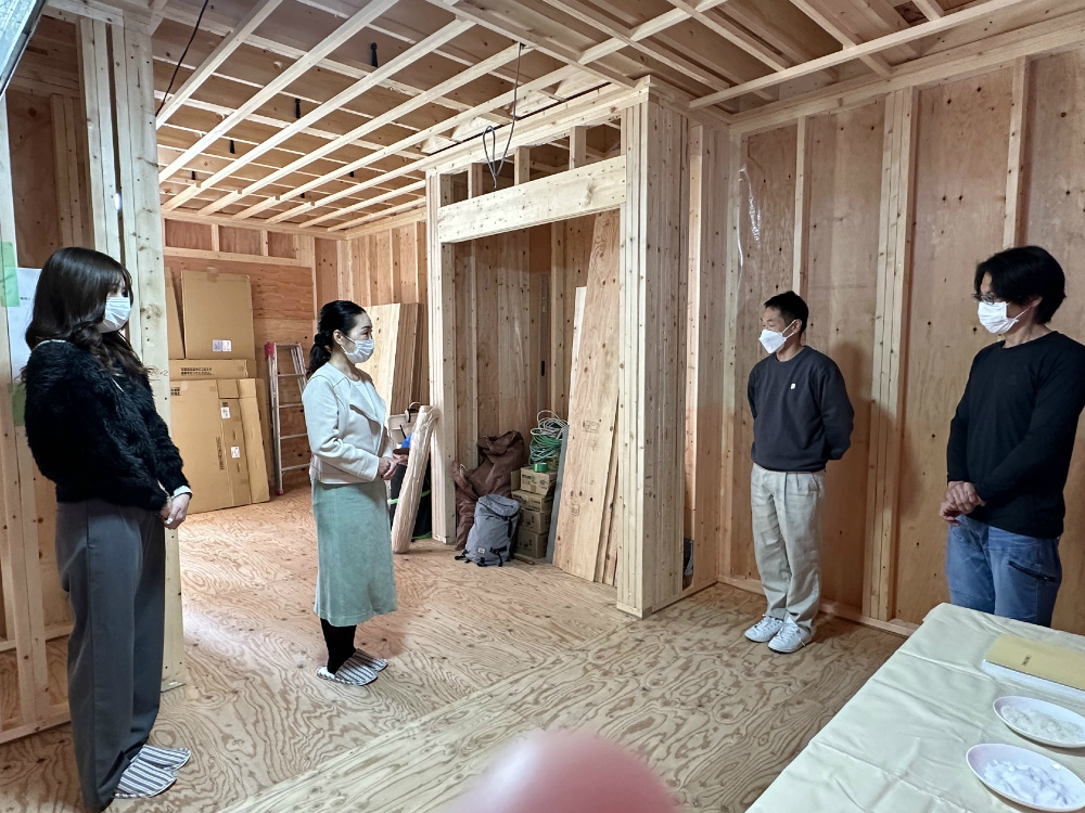 IdealHomeでは上棟時には、お施主様そして家づくりに携わる大工さん、電気屋さんスタッフとお互いに自己紹介を兼ねてご挨拶して頂いております。